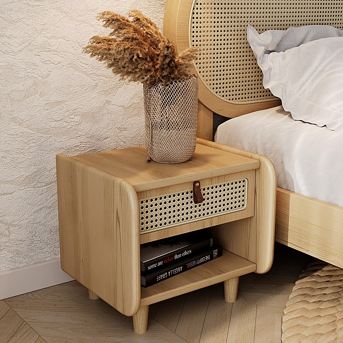 - El İşi Rattan Detaylar: Çekmece önünü süsleyen rattan örgü, komodine özgün ve şık bir görünüm kazandırıyor. Rattan malzemenin doğallığı, ahşap ile birleşerek huzurlu ve dinlendirici bir atmosfer yaratıyor.